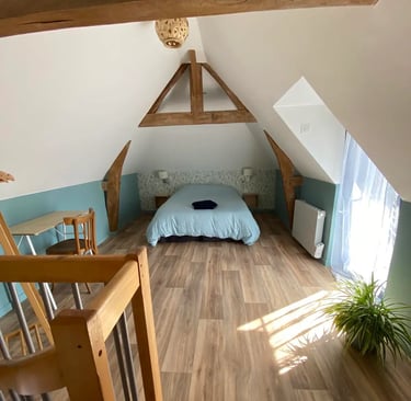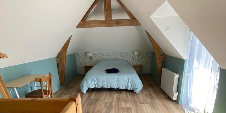 A l’étage, vous trouverez une chambre chaleureuse équipée d’un lit double (140x190 cm) pour un confort optimal. La chambre dispose également d’un bureau, d’une penderie spacieuse pour ranger vos affaires et d'un volet roulant, vous assurant ainsi intimité et tranquillité pour la nuit.