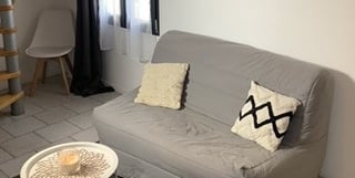 Le salon est aménagé avec un canapé-lit de 120x190 cm, offrant un espace de détente confortable en journée et un couchage supplémentaire la nuit si besoin.